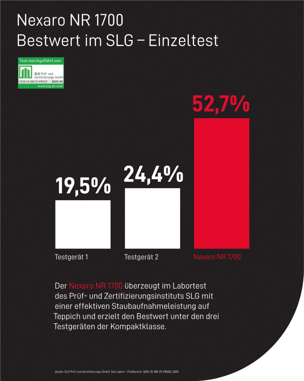 Der Nexaro NR 1700 hat im unabhängigen Labortest des Prüf- und Zertifizierungsinstituts SLG die Bestleistung in der Staubaufnahme erzielt und sich damit deutlich von zwei getesteten Wettbewerbsgeräten abgesetzt. Unter praxisnahen Bedingungen gemäß dem europaweit anerkannten Prüfstandard EN IEC 62885-7:2020 erreichte der autonome Reinigungsroboter eine Staubaufnahme von 52,7 Prozent auf Teppichboden – ein Spitzenwert in seiner Klasse. Die beiden Vergleichsgeräte erzielten im Test lediglich 19,5 Prozent beziehungsweise 24,4 Prozent.
