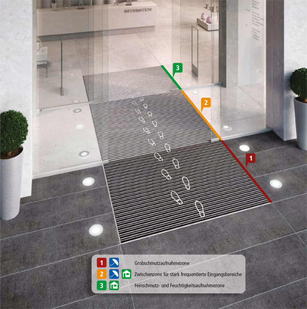 Das mehrstufige Mattensystem – Grobstreifer, Feinstreifer, Feuchtigkeitsabsorber – ist nach wie vor ungeschlagen im täglichen Einsatz – sofern man es auch tatsächlich wie vorgesehen platziert. So lautet die gängige Expertenmeinung in der Branche. Um diese hohen Einsparungsmöglichkeiten sowohl bei der Schmutzvermeidung als auch bei der Kosteneinsparung zu erreichen, ist freilich auch die regelmäßige und richtige Wartung ausschlaggebend, bekräftigt beispielsweise Jürgen Wahl, seit dem Frühjahr neuer Geschäftsführer von Scheybal, der das Unternehmen „im Geiste von Cornelia Wilcek-Scheybal“ weiterführen will. Er betont, dass die regelmäßige Kontrolle und Instandhaltung nicht nur die Langlebigkeit des Produktes fördere, sondern auch zu Sicherheit und Hygiene beitrage: „Man möchte ja nicht, dass Kunden oder Besucher stolpern oder gar ausrutschen. Man kann sagen: Je eher der Schmutz abgefangen wird – also schon im Eingangsbereich – desto besser können die weiteren Stockwerke sauber und sicher gehalten werden.“